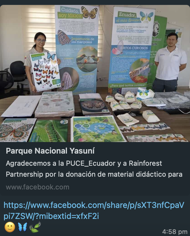 We created and delivered a package of environmental education materials for the Ministry of Environment offices in Yasuni National Park in order to support their current programs for children in local communities.